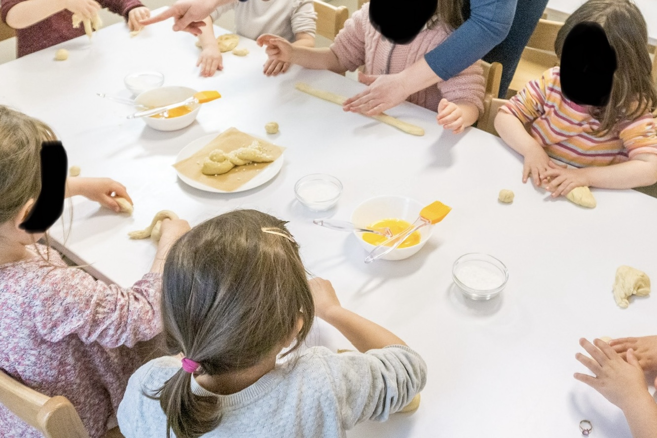 Ein weiteres Highlight der Vorbereitungszeit war das Backen eines traditionellen Ostergebäcks. Jedes Kind hatte die Gelegenheit, gemeinsam mit unserer pädagogischen Leitung, zu backen – ein duftendes Erlebnis, das alle Sinne ansprach. Im Atelier durften die Kinder außerdem kreative Osterhasen-Anhänger basteln.
