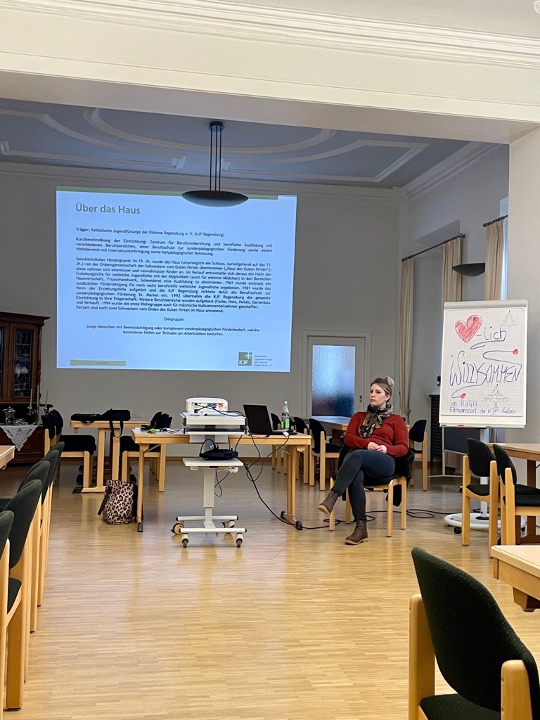 Begrüßt wurden wir von Frau Lisa Dirmeier, Bereichsleitung Wohnen, die uns mit viel Engagement und Fachwissen einen umfassenden Überblick über die Einrichtung gab. Dabei stellte sie die stationären Wohngruppen sowie die Internatsgruppen vor und erklärte anschaulich die pädagogische Arbeit mit Jugendlichen im Alltag. Besonders spannend war es, mehr über die vielfältigen Aufgaben und Herausforderungen pädagogischer Fachkräfte in diesem Bereich zu erfahren.