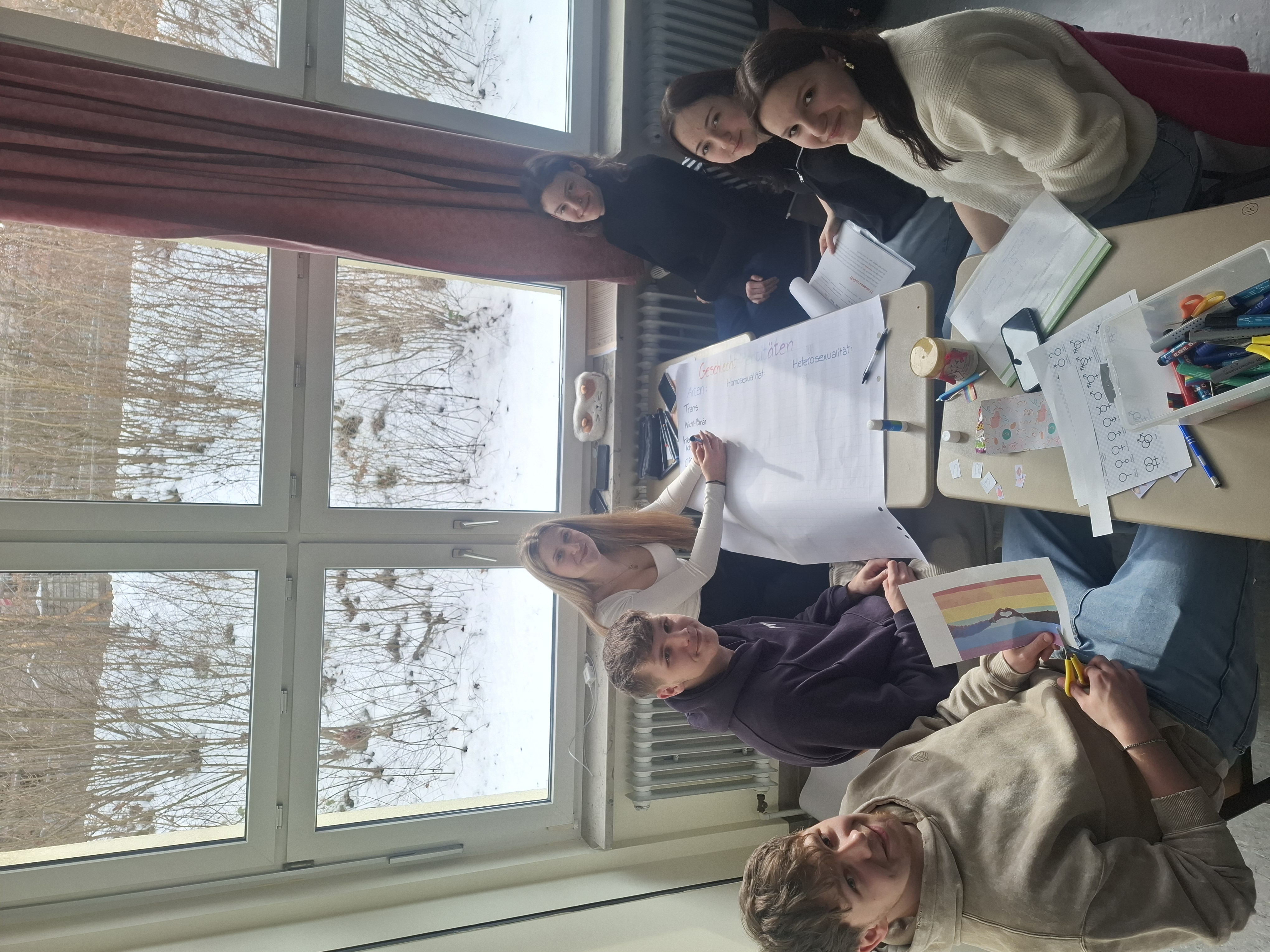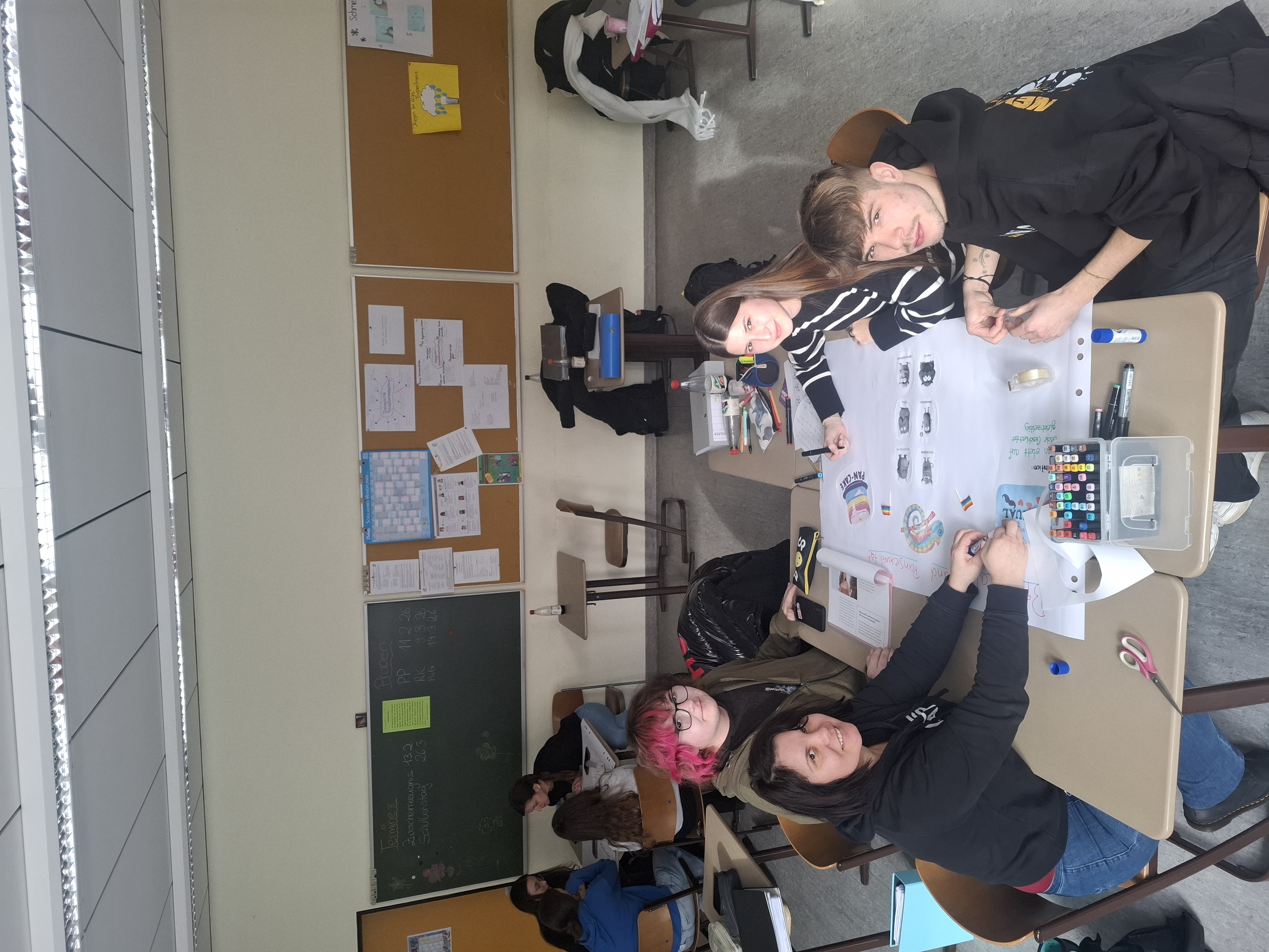 Daraufhin wurden die Klassen in 4 Gruppen geteilt und erarbeiteten sich, mit der Hilfestellung der Moderatorin und anhand ihres vorliegenden Textes, Ergebnisse zu den Themen „Vielfalt der Geschlechtsidentitäten“; „Diversität der sexuellen Orientierungen“ und die damit verbundenen „Gesellschaftlichen Stigmata“.