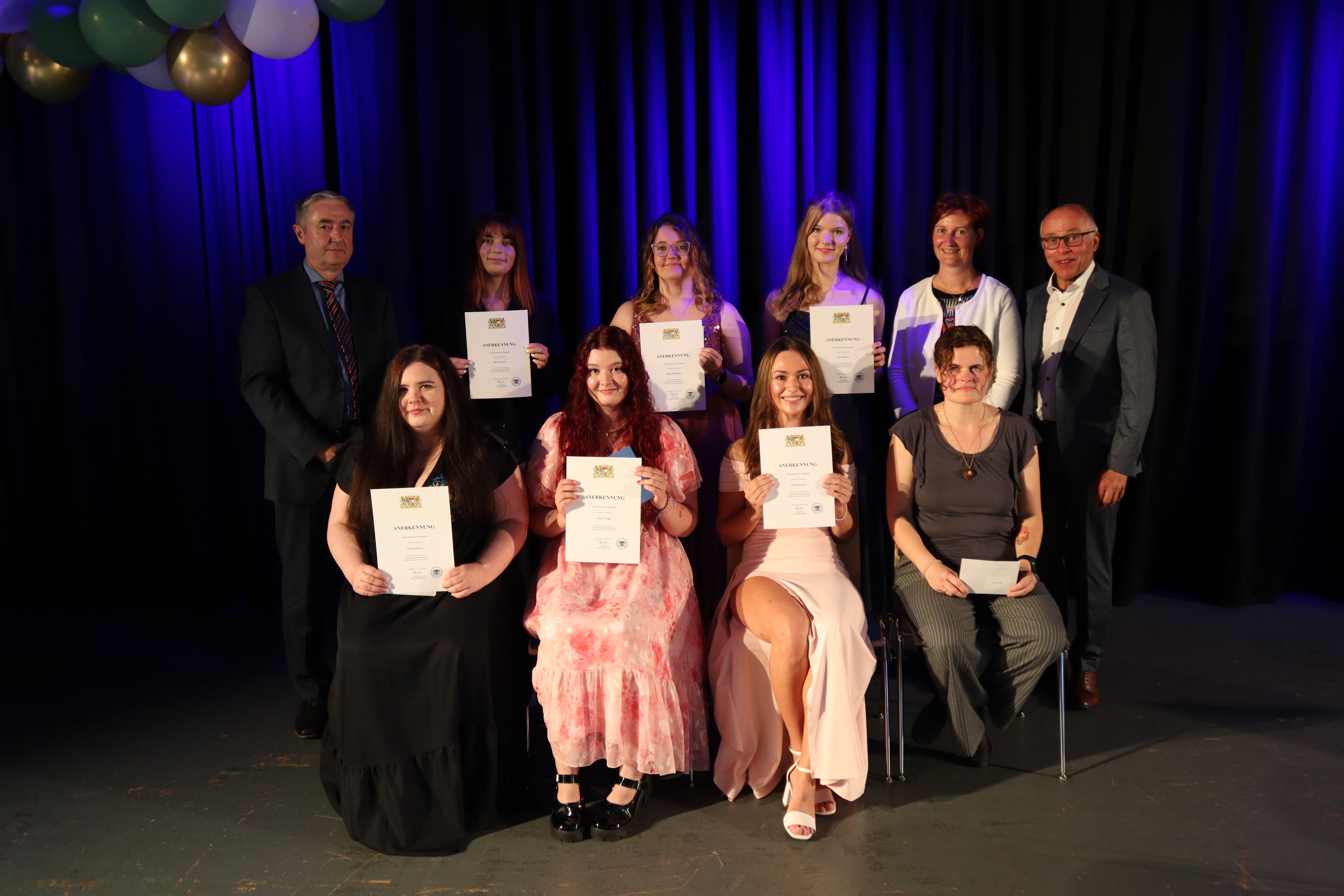 Highlights waren neben der Prämierung zweier Schüler, die im Abschlussjahr keinen Fehltag vorwiesen, die Ehrung der Prüfungsbesten, die Preise der Regierung und des Landkreises erhielten. Die Berufsurkunden und Zeugnisse wurden von Schulleitung, Klassenleitung und Fachbetreuern an 43 Kinderpfleger/innen, 11 Helfer/innen der Ernährung und Versorgung und 9 Sozialbetreuer/innen und Pflegefachhelfer/innen verliehen. Zudem erhielten 10 Teilnehmer ihre Urkunden als Kinderpfleger/innen, die die 15 Prüfungen als externe Teilnehmer/innen erfolgreich ablegten.
