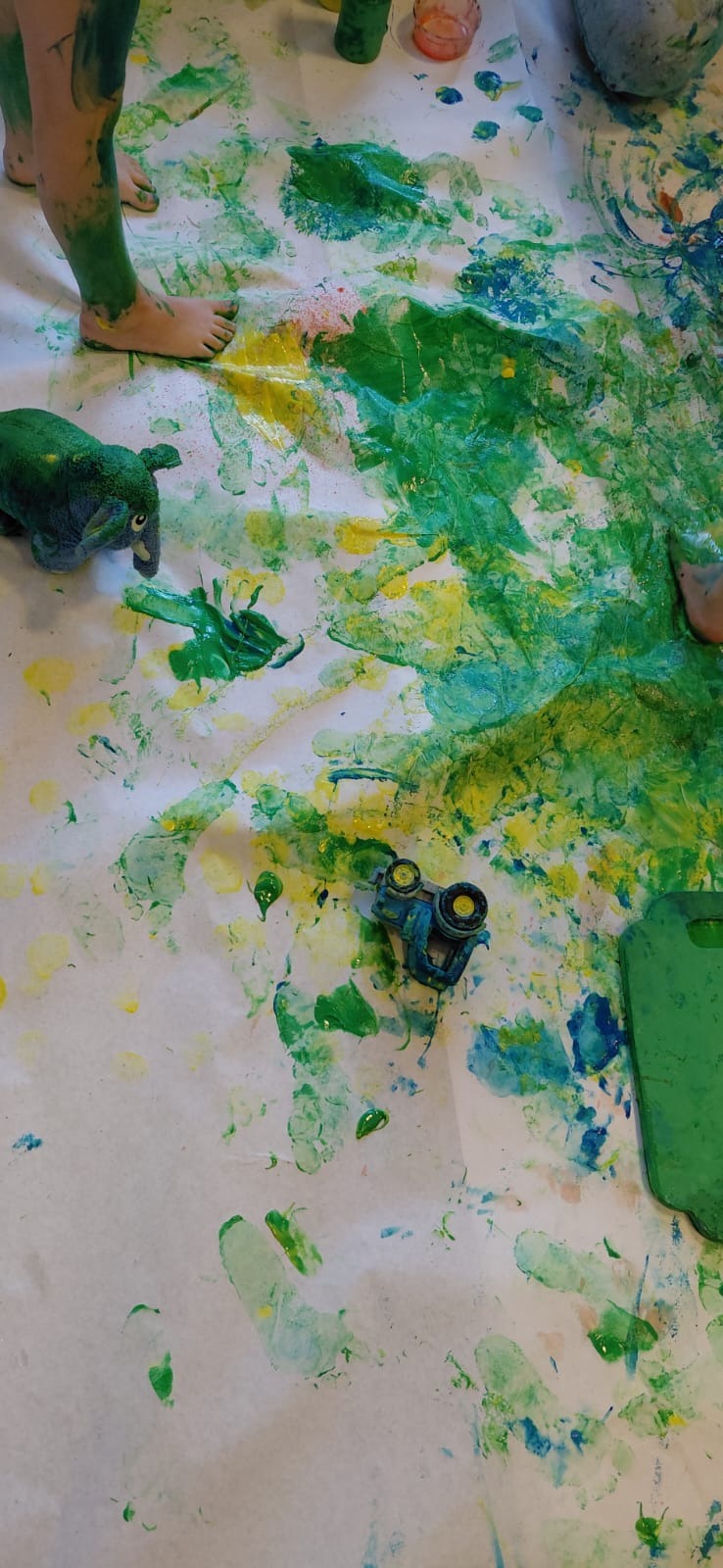 Im Januar kam auch Jana in den Kindergarten. Jana fährt von Kindergarten zu Kindergarten und führt mit den Kindern ein Farbenexperiment durch. Hierfür wurde der Kreativraum vollständig mit Folie und Papier ausgelegt, sodass die Kinder die Farben frei und mit allen Sinnen erleben konnten. Die Kinder durften die Farben mit Händen, Füßen und teilweise mit dem ganzen Körper erkunden. Es war interessant zu beobachten, wie sich manche Kinder im Bezug der Farbe verhalten haben. Einige sehr vorsichtig, die anderen sehr intensiv. Als Malwerkzeug kamen unter anderem Kuschel-Elefanten und Autos zum Einsatz.